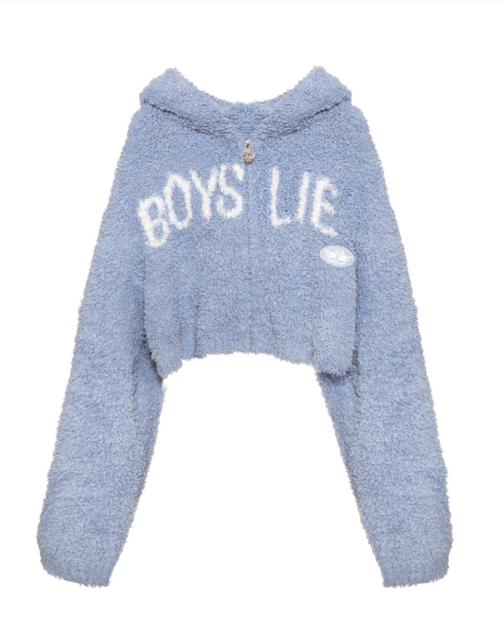 This cozy cropped zip-up hoodie from Boys Lie is crafted from their all-new ultra-soft fuzzy fabric, offering both warmth and comfort. Featuring a relaxed fit with a plush texture, it's finished with the bold Boys Lie graphic across the chest and a signature patch detail on the side.