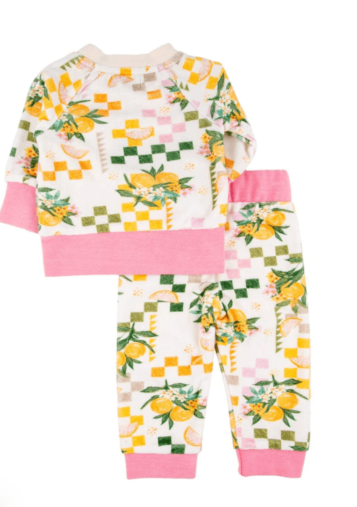 Brighten up her day with this adorable baby girls' 2-piece set, featuring a loop terry Tropicana all-over print long-sleeve pullover and matching bottoms. The pullover showcases a playful tropical print in soft loop terry fabric, offering a cozy and relaxed fit perfect for little ones on the move. The matching bottoms complement the pullover with the same fun print, creating a coordinated look that's both stylish and comfortable. Ideal for playdates, outings, or lounging at home, this set provides both charm and practicality for your little fashionista
