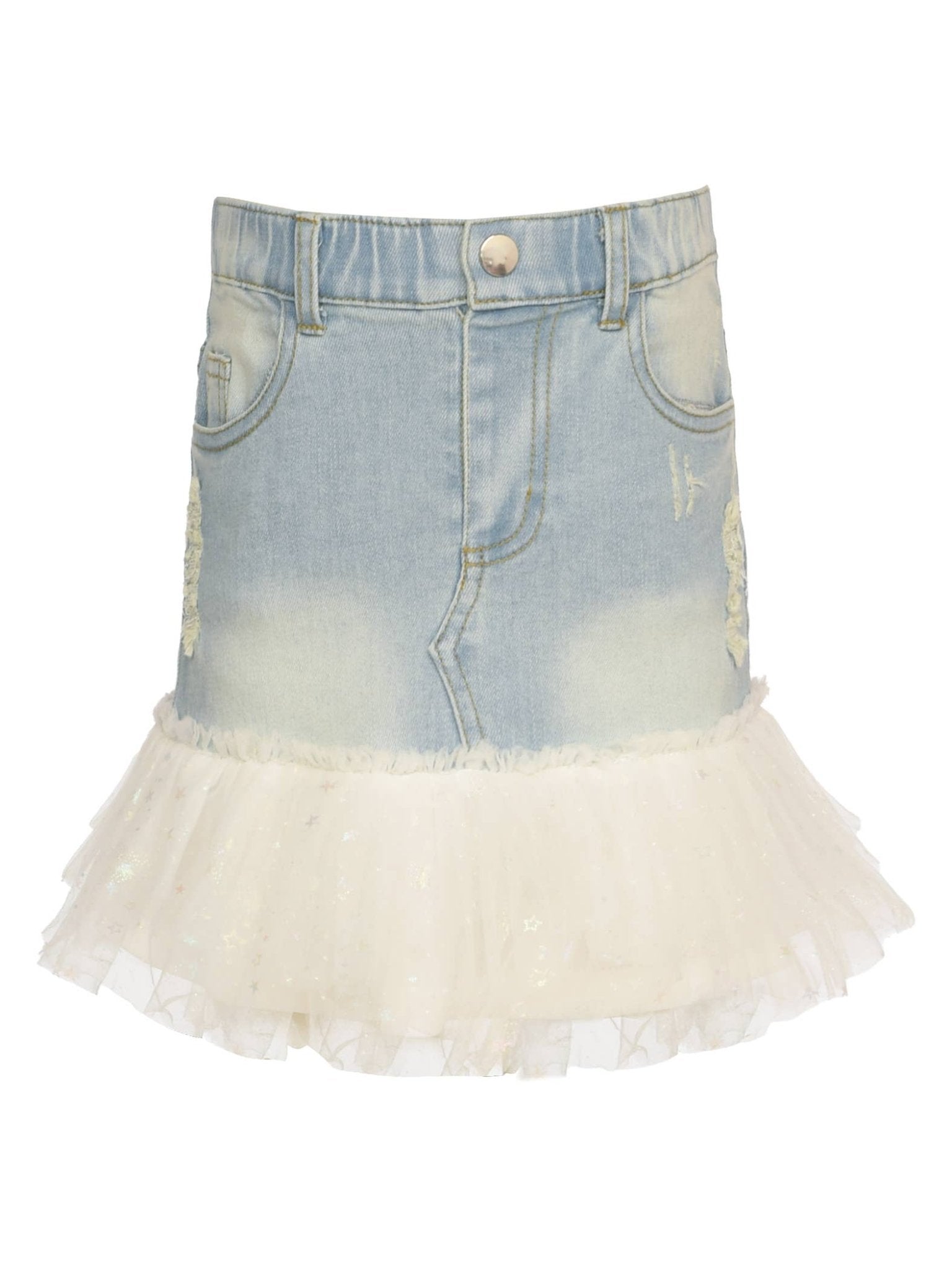 Our Hannah Banana Denim Skirt with Tutu Hem is perfect for the spring/summer season. It's a blend of practicality and flair, crafted with attention to detail. This skirt captures the unique style of Sara Sara, combining the casualness of denim with the whimsy of a tutu hem. It's a fashionable choice for young girls. High-quality materials and exclusive trims add to its charm. It's more than just a skirt, it's a style statement for the fashion-forward young lady.