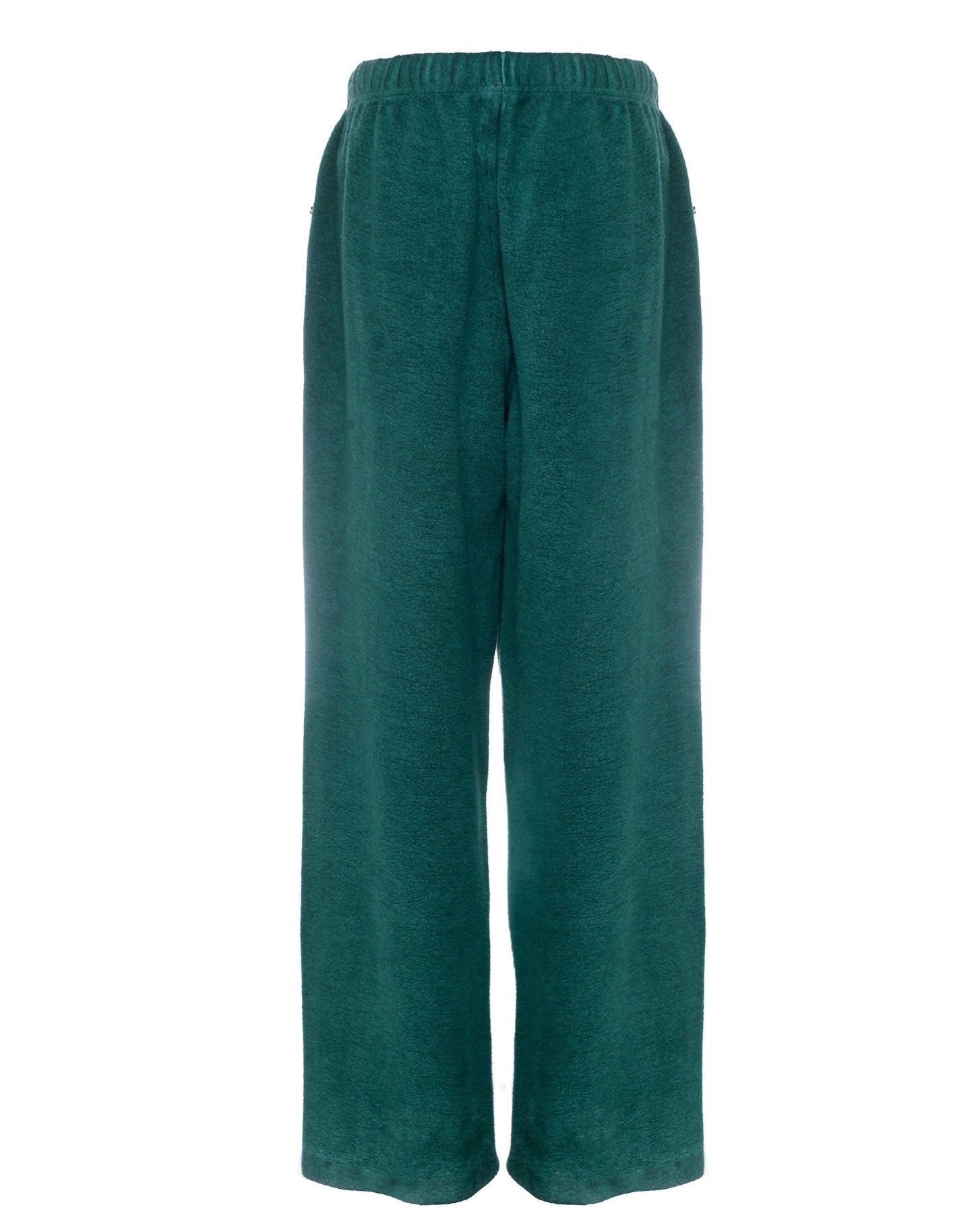 These forest green fleece pants from Boys Lie feature a relaxed, wide-leg fit with an elastic waistband for all-day comfort. Embroidered logos on the front add a clean, sporty touch to the cozy silhouette.