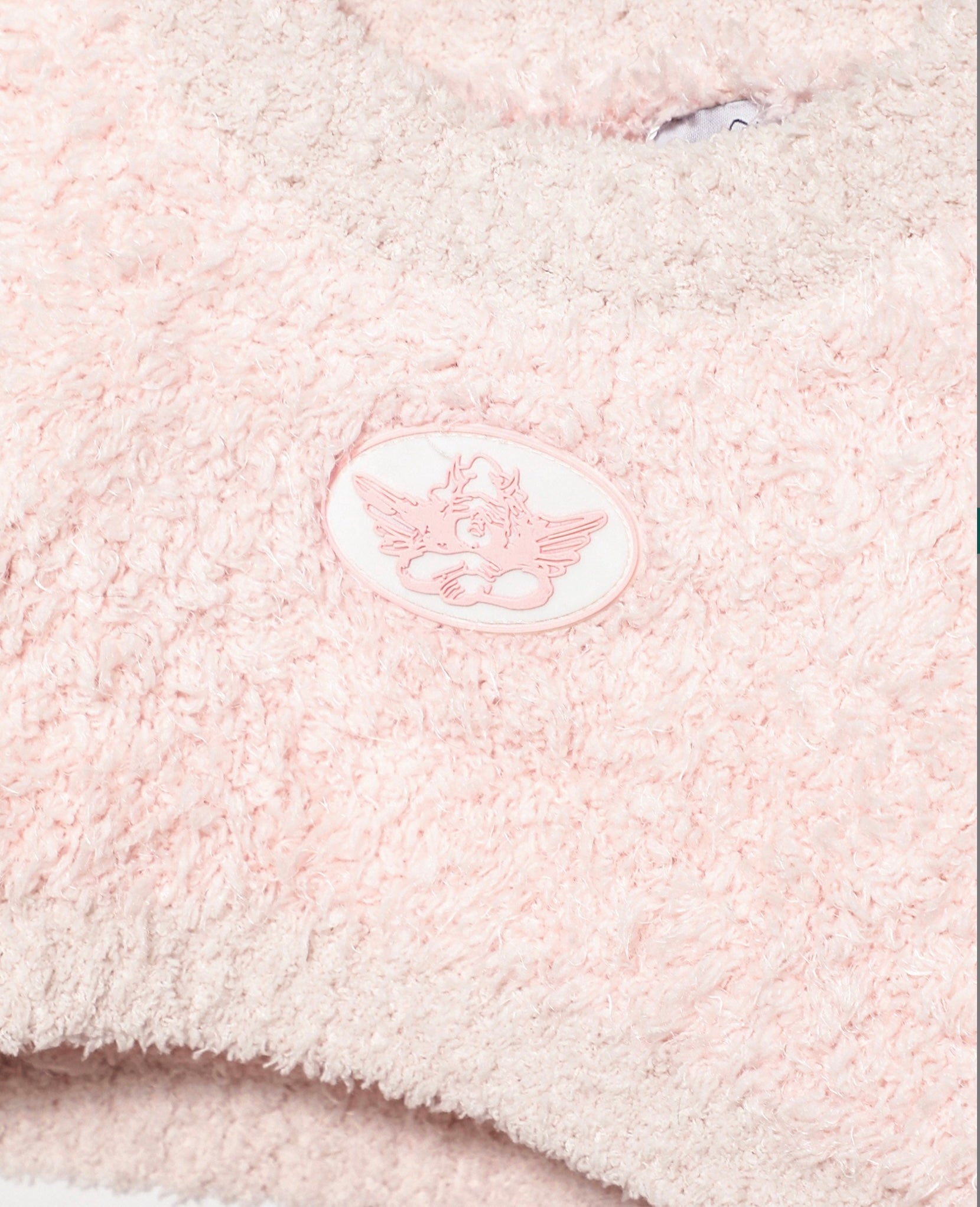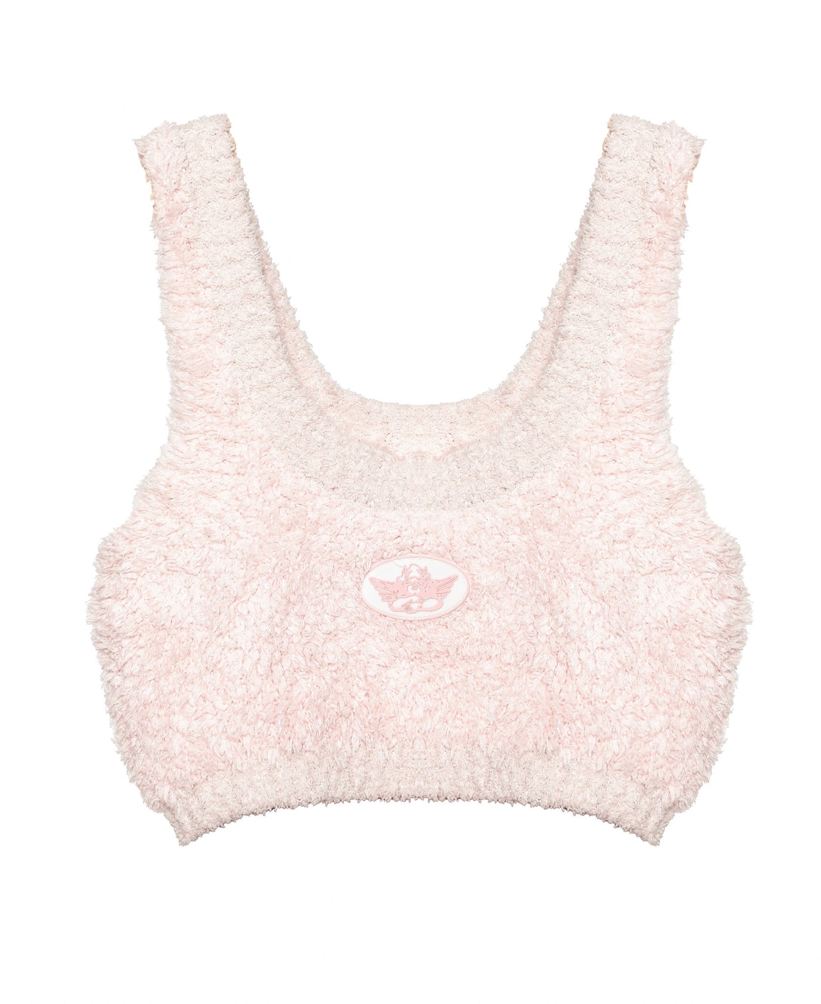 This soft, plush cropped bra-like top features a cozy, two-toned light pink design that gives it a gentle, feminine look. A small matching light pink patch at the center adds a subtle touch of charm and detail to the snug, comfortable fit.