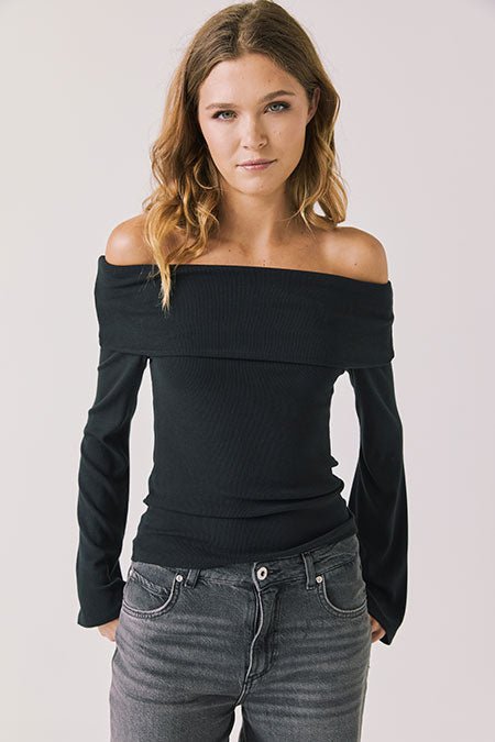 The Pixie True Black Long Sleeve features a sleek, fitted body with long sleeves and an off-the-shoulder design for effortless chic elegance.