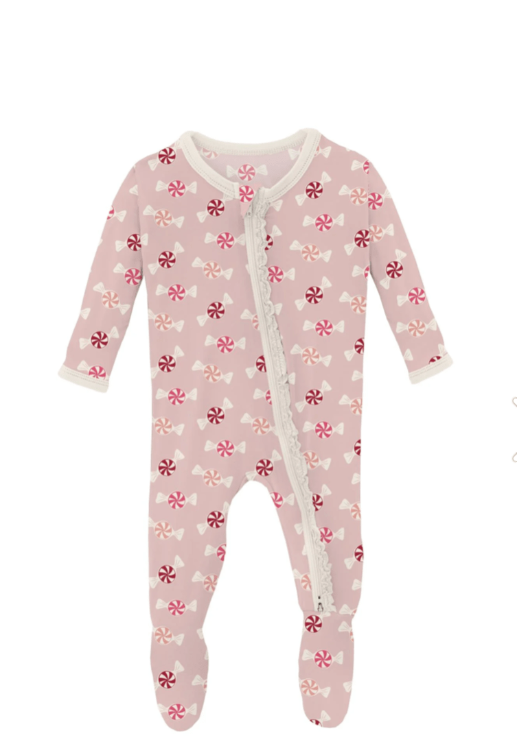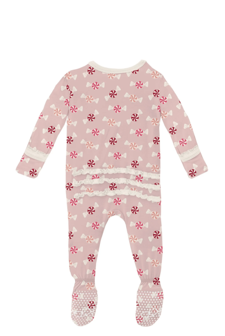 Print muffin ruffle footie with 2 way zipper in baby rose peppermints