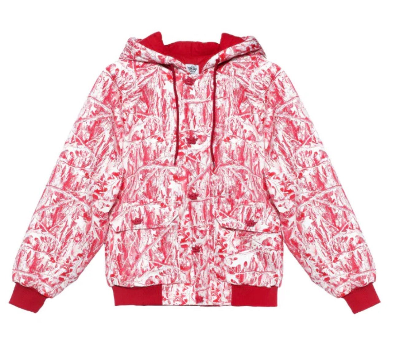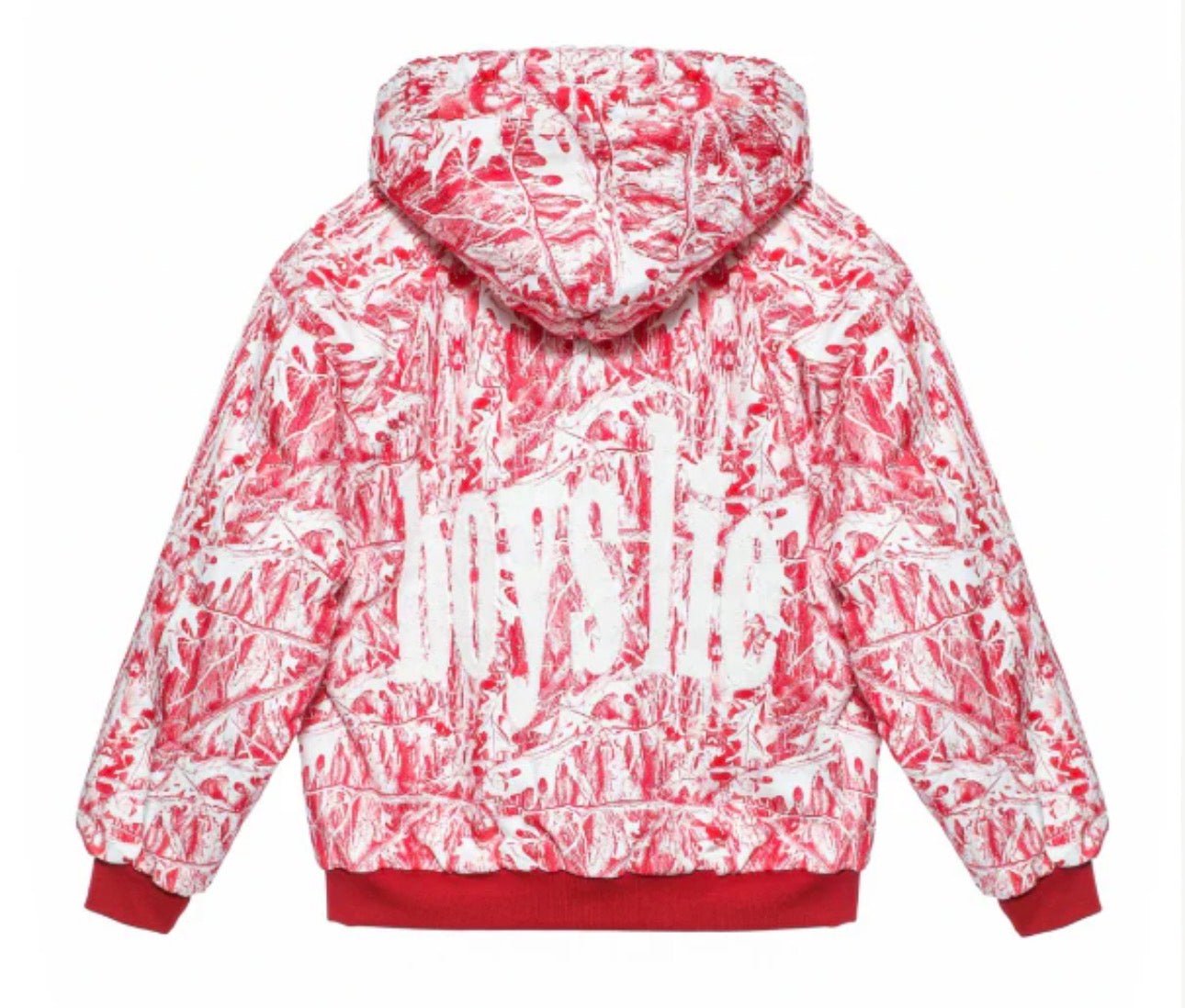 This red and white puffer hoodie makes a bold statement with its allover camo-inspired print and plush embroidered Boys Lie logo across the back. Designed with ribbed trim, front pockets, and a soft contrast lining, it's a standout cold-weather piece that mixes warmth, comfort, and street-style edge.