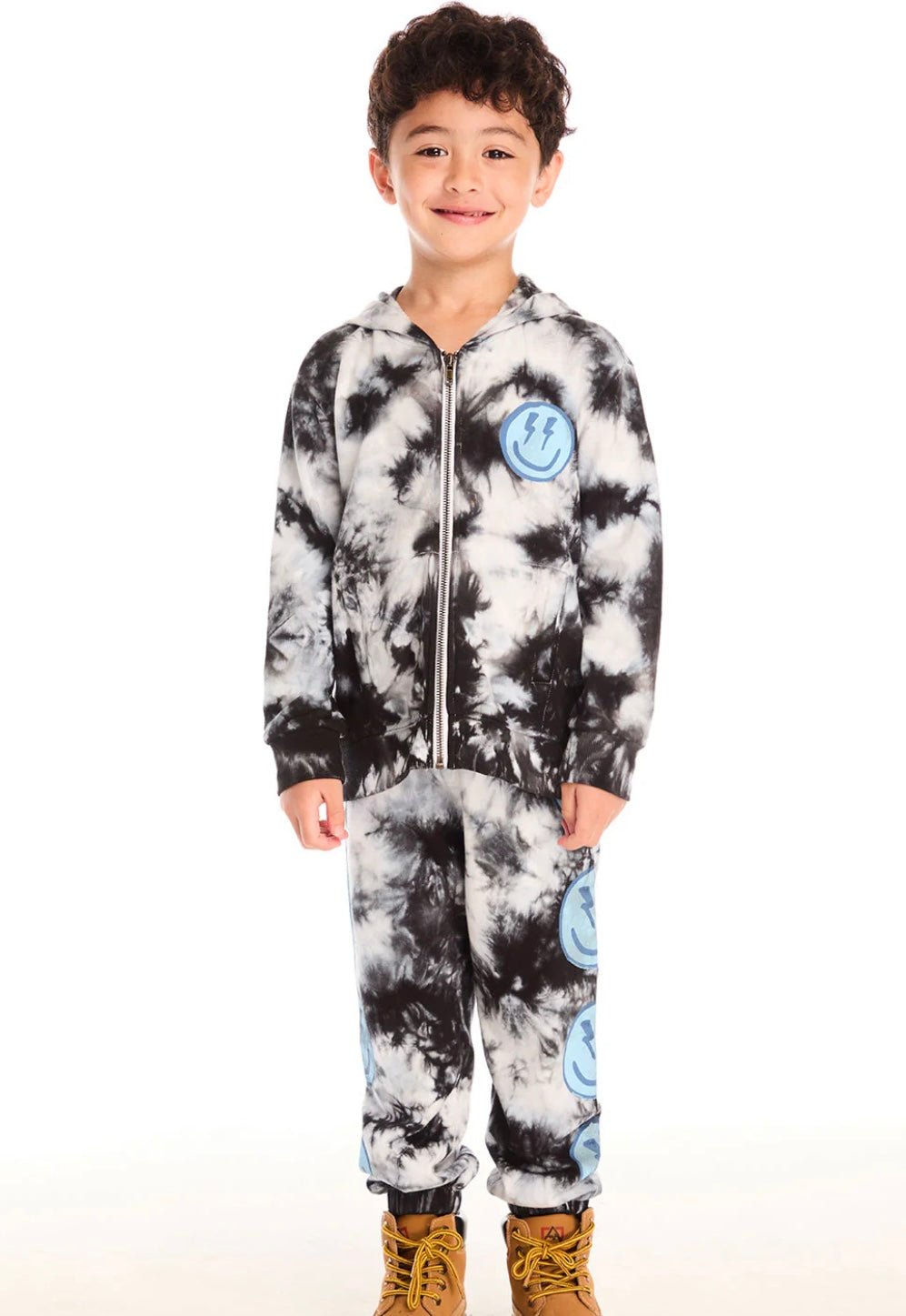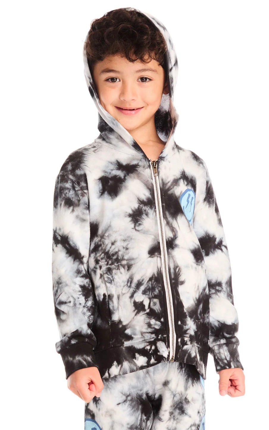 Make a style statement with the Smiley Bolt Hoodie, featuring a bold black and white tie dye design accented by light blue smiley and bolt icons.