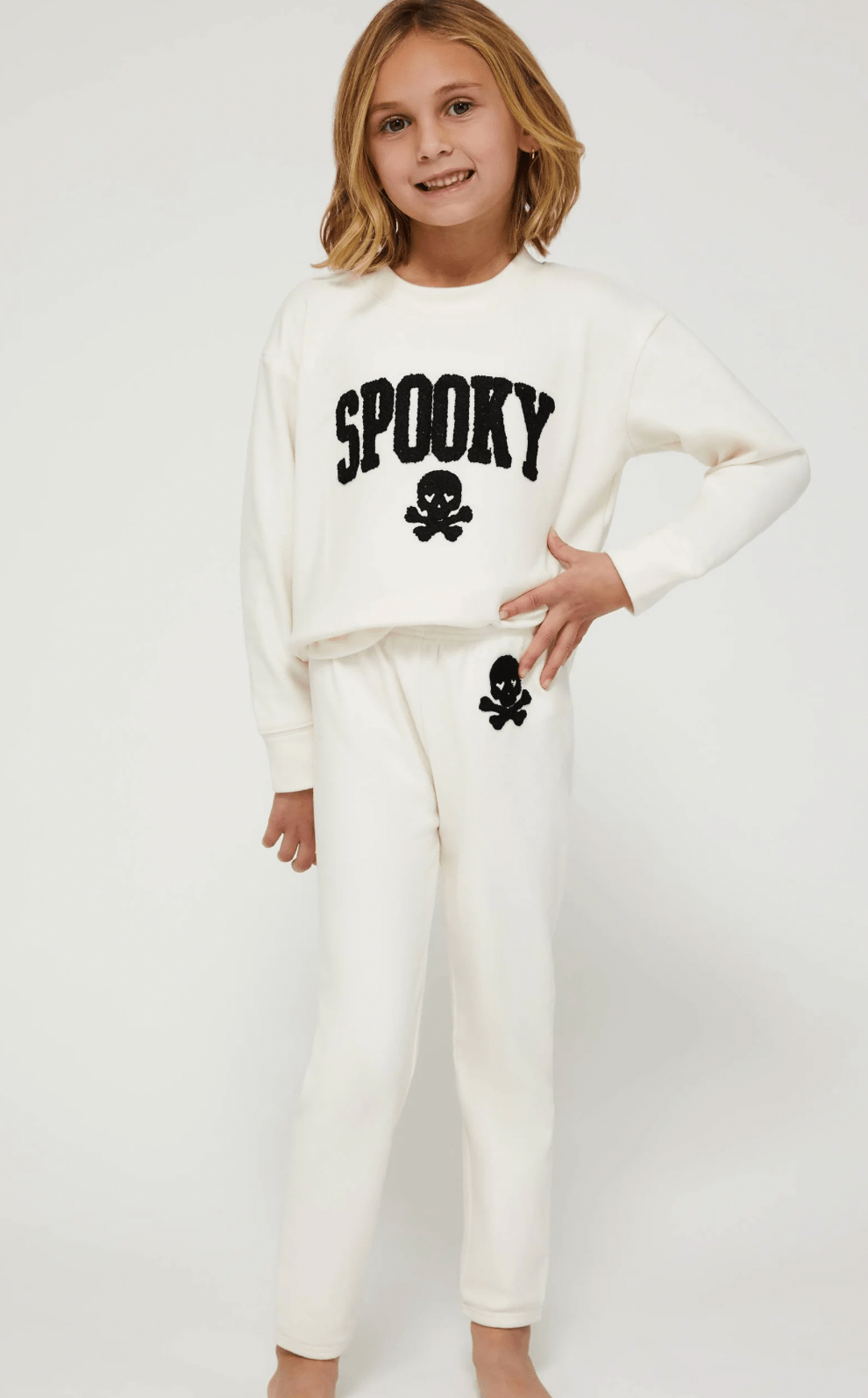 The Georgie Pant is our classic super-soft jogger with a relaxed, oversized fit. Pair it with the matching Cassia Top in cream for a cozy lounge set this spooky season. It is made of plush fabric with chenille lettering and a skull patch. Pair it with the matching Little Cassia Top for the perfect lounge set for your little one this spooky season.