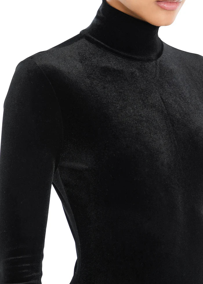 Long sleeve, hot short velvet romper. Shown here in Black.